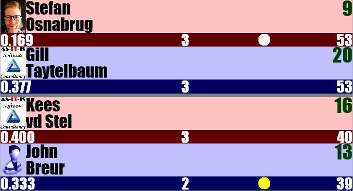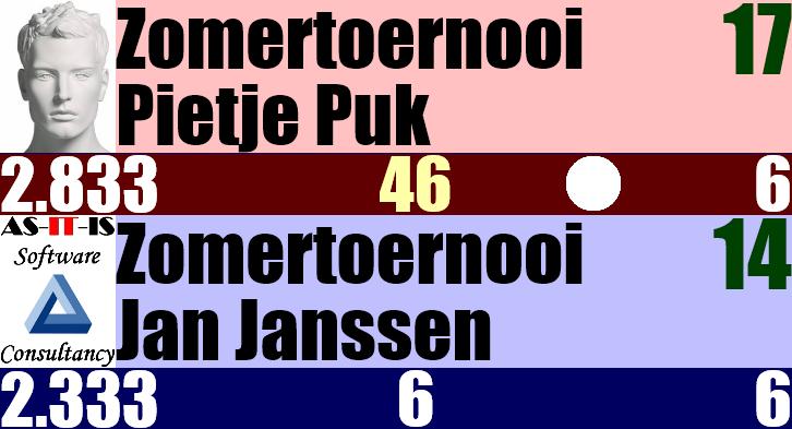 Na iedere set draaien de namen en de balkleur automatisch. Er is geen nabeurt met sets. Best of 17 is het maximum (eerste speler met 9 gewonnen sets).