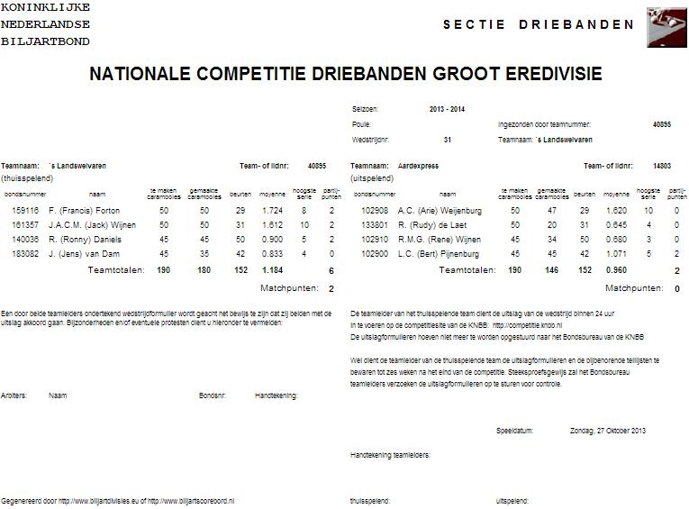 van de wedstrijd is er een afdruk van het uitslagformulier conform de KNBB beschikbaar.